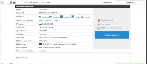 сейчас на нюке # 1511 "CaXaPoK" STEAM_0:0:386944914 09:06 72 0 active поздно . [SM] Console: Игрок "CaXaPoK" забанен навсегда (причина: SMAC 0.8.5.1: Aimbot Detected). [SourceBans] Console: Игрок "CaXaPoK" забанен навсегда (причина: SMAC 0.8.5.1: Aimbot Detected). CaXaPoK (STEAM_0:0:386944914) отключился Сообщение отредактировал CRIMEA - 4 сентября 2014 20:06 |