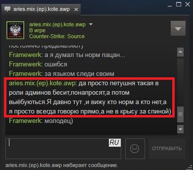 Ну давай я тебе все расскажу Все что будет сказано мною в твою сторону, это только как игроку в рамках игры (ничего личного)! 1) Все плохие кроме тебя, и тех кто за тебя впрягается! 2) На карте ты оскорбляешь игроков на ровном месте, конфликты происходят на разной почве! 3) У тебя нет нисколько уважения к основной части игроков, хотя ты сам его вообще не заслуживаешь! 4) Тебя много раз предупреждали, давали мут, объясняли, и т.д., но ТЫ НЕ ПОНИМАЕШЬ (есть игроки, которые косячут в рамках слов, они получают муты, но молчат и ничего не пишут, понимают что не правы), а ты сразу чиркаешь на форум, будь ответственным за свои действия, виноват - получи и терпи! 5) Данный срок выбран для твоего длительного раздумья над своими действиями и словами! 6) Если считаешь, что наказание не справедливо (можешь устроить опрос у админов), я УВЕРЕН, что решение не поменяется! (некоторые тебе даже пожизненно готовы дать мут, так что, еще по-божески обошлось)! Пруфы ниже: И да, решение изменить может только Div (поэтому жаловаться нет смысла другим)... Сообщение отредактировал Husein_Gloom - 1 марта 2015 10:01 |